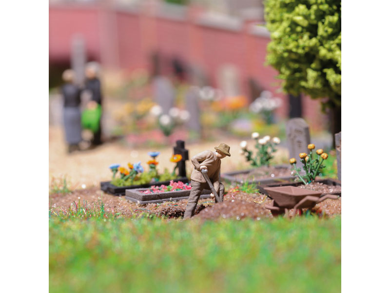 Sada obsahuje figurku hrobníka kopajícího díru, hromadu hlíny, kolečko, koště, lopatu a kbelík. Nevhodné pro děti do 14 let.