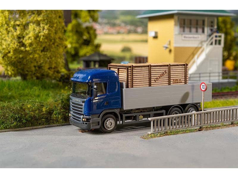 Scania R 13 HL s naloženou dřevěnou bednou – Herpa. Mikrospínač pro zapnutí/vypnutí, realistické chování při rozjezdu a brzdění, ovladatelné světelné a zvukové funkce, hnací motor s výkonovou regulací, lokalizace polohy pomocí ultrazvukového vysílače, výkonný rádiový vysílač a přijímací modul, vysoce kvalitní elektronické komponenty, výkonnou baterii NiMh (rychlonabíjení), snímač magnetického pole, pevné gumové pneumatiky pro dobrou adhezi, řiditelná náprava s vodítkem a magnetem, 3-kolíková nabíjecí zásuvka pro několik hodin provozu na jedno nabití, možnost analogového jízdního režimu, podrobný návod. Vezměte prosím na vědomí, že pro zajištění bezpečného provozu je potřeba pro stavbu silnic používat pouze originální materiály FALLER. Náhradní díly jsou k dispozici u specializovaných prodejců nebo přímo u společnosti FALLER. Není určeno pro děti do 14 let.