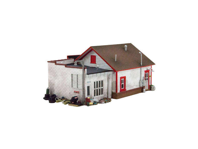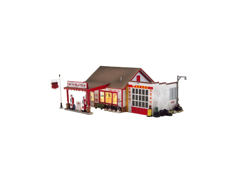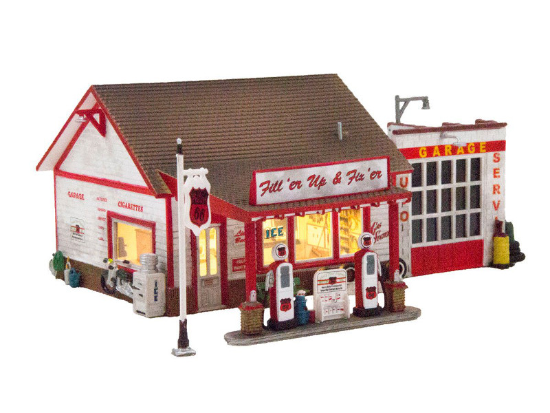 Hotový model čerpací stanice s autodílnou. Součástí balení je mnoho dekorativních doplňků. Vnitřní LED osvětlení. Rozměr: 15,6 x 13,7 cm, výška: 6,66 cm. Nevhodné pro děti do 14 let!