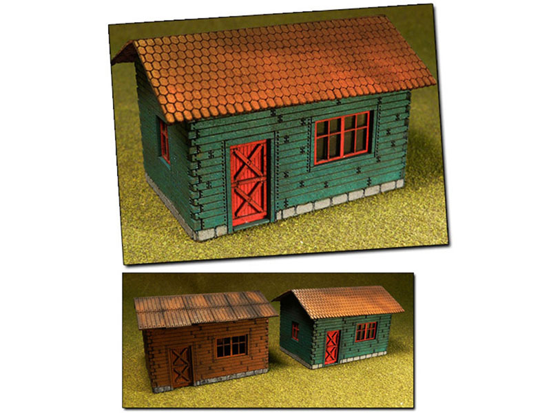 Stavebnice vyrobená z kartonu metodou laser-cut obsahuje dvě chatky.