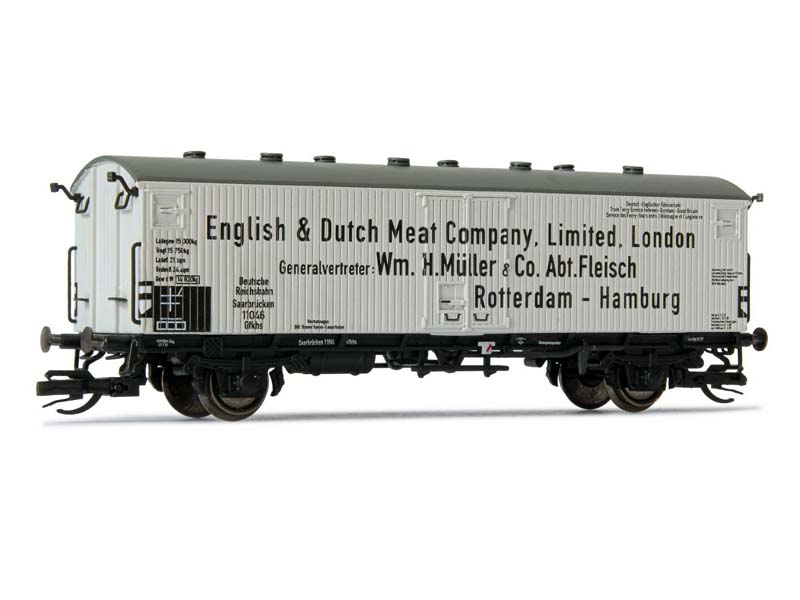 Model chladírenského vozu řady Gfkhs, Saarbrücken English & Dutch Meat Company, DRG. Model má šachtu a kinematiku krátkého spřáhla a umožňuje tak jízdu nárazník na nárazník. Minimální poloměr oblouku 310 mm. Není vhodné pro děti do 14 let.