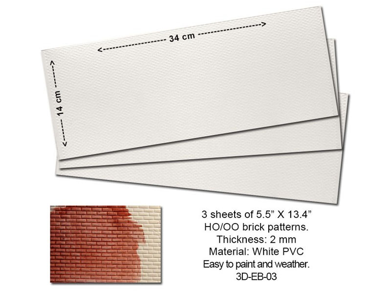 Reliéfní plastové desky lze použít pro silnice, chodníky, i zdi v měřítku H0/00. Snadné barvení emailovými i akrylovými barvami. Sada obsahuje 3 desky, každá o rozměrech 16 x 34 cm, tloušťka 2 mm v bílé barvě.