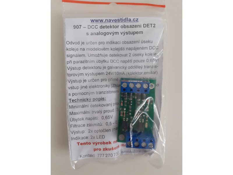DCC detektor obsazení DET2 slouží pro detekci obsazenosti dvou kolejových úseků. Pracuje na základě proudového odběru od cca 1mA . Napájení: DCC (svorka J a K), napěťový úbytek: 0,65V (mezi svorkami J a J1,J2), minimální detekovaný proud: 1mA, maximální trvalý proud: 3A, výstup: 2x tranzistorový optočlen, proudové zatížení výstupů: max. 12V/20mA, filtrace zákmitů: cca 0,5s, indikace: LED.