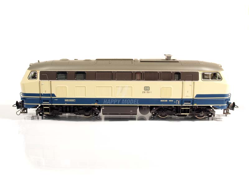 Německé spolkové dráhy zařazovaly od roku 1971 do provozu 398 lokomotiv řady 218 a používaly je na osobních i nákladních vlacích. Lokomotivy řady 218 jezdily na většině neelektrifikovaných tratí a mohou dosáhnout maximální rychlosti 140 km/h s výkonem 1 840 kW. Řada 218 prošla v průběhu let řadou barevných variant. První 218 byly dodávány ještě v karmínovém barevném provedení, obvyklém pro dieselové lokomotivy. Od roku 1975 určovaly vzhled lokomotiv barvy oceánská modrá/béžová. Model: Extra připojené díly, částečně leptané. Model má prototypové nízké okolky kol. Sady kol s 1,2 mm vysokými okolky k dispozici jako náhradní díly (č. položky 145433, 145435). V digitálním režimu separátně ovládaná světla. K dispozici stanoviště strojvedoucího pro Z21. Osvětlení LED závislé na směru jízdy. Minimální poloměr oblouku 358 mm. Provozní číslo 218 150-1. Kinematika krátkého spřáhla s kulisou dle NEM. Není vhodné pro děti do 14 let.