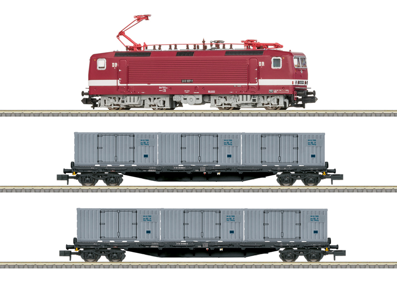 Předloha: Pýcha Říšské dráhy elektrická lokomotiva 243 357-1, vyráběná od roku 1984, a dva plošinové vagóny typu Rgs 3910 německé Říšské dráhy (DR). Naložená třemi 20-stopými poštovními kontejnery. Provozní stav cca 1990. Model: Lokomotiva s tlakově litou zinkovou karoserií a rámem. Vestavěný digitální dekodér a generátor zvuku pro provoz s mfx a DCC. Motor se setrvačníkem, poháněné 4 nápravy, trakční bandáže. Světlomety a zadní světla se mění podle směru jízdy, teplé bílé LED diody, osvětlení kabiny, světlomety závislé na směru jízdy, digitálně přepínatelné. Lokomotiva a vozy s kinematikou krátkého spřáhla. Sada dále obsahuje mobilní stanici, připojovací box pro napájení kolejí, spínaný zdroj 230 V/30 VA, kolejový ovál s poloměrem oblouku R2. Požadovaný půdorys: 90 x 47 cm. Není vhodné pro děti do 15 let.