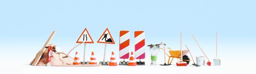 Set obsahuje výstražné dopravní značky, hromadu písku, sbíječku, kolečko a další ruční nářadí. Nevhodné pro děti do 15 let.