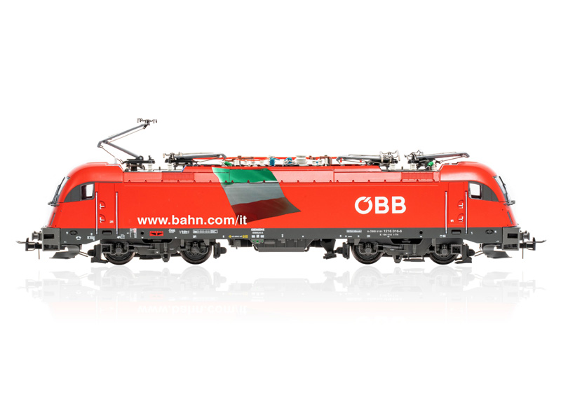 Model elektrické lokomotivy 1216 ÖBB s italskou vlajkou. Možnost dálkových světel. Světla závislá na směru jízdy. Minimální poloměr oblouku 358 mm.