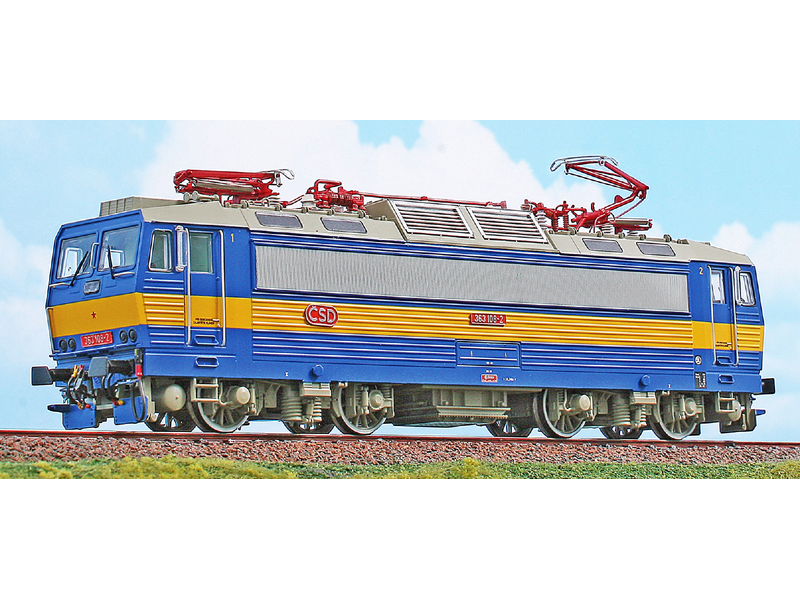 Model lokomotivy v modro/žlutém nátěru ESO.