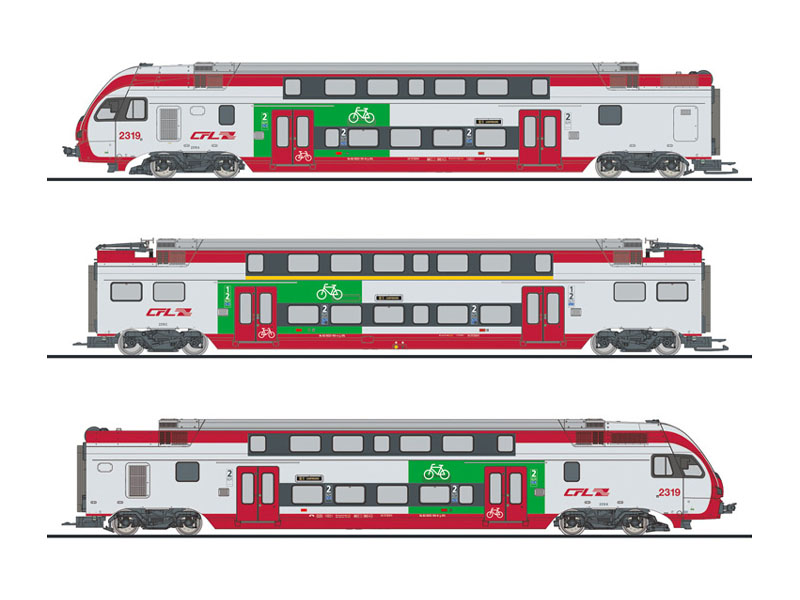 KISS (Komfortabler Innovativer Spurtstarker S-Bahn-Zug) je elektrická dvoupatrová vícenásobná jednotka švýcarského výrobce Stadler Rail pro standardní a široký rozchod. Byl vyvíjen v letech 2008 až 2010 pod názvem Stadler Dosto (dvoupatrový) a od roku 2011 se prodává v několika sériích široké škále železničních společností ve 48 zemích – kde působí pod nejrůznějšími názvy. Vozidlo je sice koncipováno jako dvou až osmivozová vlaková jednotka, ale dosud bylo vyrobeno pouze jako tří, čtyř, šesti a sedmivozové provedení. K dispozici je KISS 160 (160 km/h) pro regionální dopravu a KISS 200 (200 km/h) pro dálkovou dopravu. Pohon KISSu je totožný s GTW a FLIRT, ale s vyšším výkonem zvýšeným na 750 kW. Hnací podvozky byly také převzaty z Flirtu. Cílem vývoje bylo získat vícenásobnou jednotku s vyšším výkonem než má souprava, tažená lokomotivou. Použitím jednotných konstrukčních skupin pro jednotlivé produktové řady lze zohlednit individuální přání zákazníků. Vozidlo lze optimalizovat pro různé výšky nástupišť. Díky průběžnému vysokonapěťovém uvedení může vlaková souprava fungovat pouze s jedním sběračem, který může být umístěn na jakémkoliv vozidle. Model: Provedení pro tříkolejnicový systém Märklin. Třívozová elektrická dvoupatrová souprava, typu KISS CFL (Chemins de Fer Luxembourgeois), číslo vlaku 2319, provozní čísla: 0023 191-8, 0023 193-4 a 0023 192-6 L-CFL, zobrazení cíle vlaku RE11 LUXEMBOURG. Provozní stav 2017. Varianta s dvojkřídlými dveřmi. V souladu s originálem v každém koncovém voze motor se setrvačníkem. Přepínatelné na odběr proudu z vrchního vedení. Přepínatelná funkce zastavení. Model vyroben částečně z kovu. Model vybaven digitálním dekodérem, příprava pro vestavbu zvukového dekodéru. Vnitřní vybavení. Vestavěné vnitřní osvětlení. Minimální poloměr oblouku 360 mm. Kompatibilita pro kolejivo M-Gleis není plně zaručena. Kinematika krátkého spřáhla s elektricky vodivými spřáhly. Není určeno pro děti do 14 let.