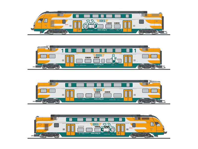 KISS (Komfortabler Innovativer Spurtstarker S-Bahn-Zug) je elektrická dvoupatrová vícenásobná jednotka švýcarského výrobce Stadler Rail pro standardní a široký rozchod. Byl vyvíjen v letech 2008 až 2010 pod názvem Stadler Dosto (dvoupatrový) a od roku 2011 se prodává v několika sériích široké škále železničních společností ve 48 zemích – kde působí pod nejrůznějšími názvy. Vozidlo je sice koncipováno jako dvou až osmivozová vlaková jednotka, ale dosud bylo vyrobeno pouze jako tří, čtyř, šesti a sedmivozové provedení. K dispozici je KISS 160 (160 km/h) pro regionální dopravu a KISS 200 (200 km/h) pro dálkovou dopravu. Pohon KISSu je totožný s GTW a FLIRT, ale s vyšším výkonem zvýšeným na 750 kW. Hnací podvozky byly také převzaty z Flirtu. Cílem vývoje bylo získat vícenásobnou jednotku s vyšším výkonem než má souprava, tažená lokomotivou. Použitím jednotných konstrukčních skupin pro jednotlivé produktové řady lze zohlednit individuální přání zákazníků. Vozidlo lze optimalizovat pro různé výšky nástupišť. Díky průběžnému vysokonapěťovém uvedení může vlaková souprava fungovat pouze s jedním sběračem, který může být umístěn na jakémkoliv vozidle. Model: Čtyřdílná elektrická dvoupatrová souprava, typ KISS ODEG (Ostdeutsche Eisenbahn GmbH), číslo vlaku ET 445.104, provozní čísla: 0445 104-3, 0446-104-2, 0446-604-1 a 0445 604-2 D-ODEG, zobrazení cíle vlaku: RE8 Wismar. Provozní stav 2021. Varianta s dvojkřídlými dveřmi. V souladu s originálem v každém koncovém voze motor se setrvačníkem. Přepínatelné na odběr proudu z vrchního vedení. Přepínatelná funkce zastavení. Model vyroben částečně z kovu. Příprava pro vestavbu zvukového dekodéru. Vnitřní vybavení. Vestavěné vnitřní osvětlení. Minimální poloměr oblouku 360 mm. Kinematika krátkého spřáhla s elektricky vodivými spřáhly. Není určeno pro děti do 14 let.