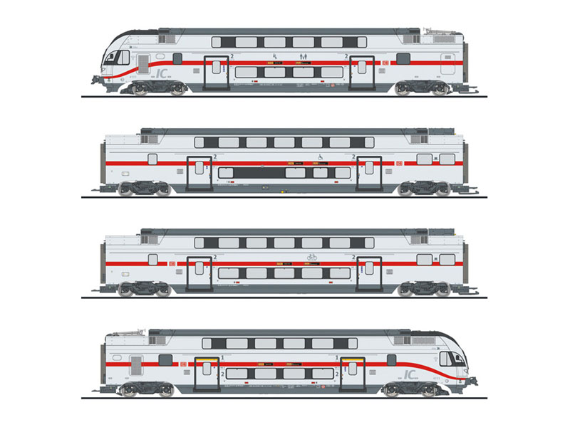 KISS (Komfortabler Innovativer Spurtstarker S-Bahn-Zug) je elektrická dvoupatrová vícenásobná jednotka švýcarského výrobce Stadler Rail pro standardní a široký rozchod. Byl vyvíjen v letech 2008 až 2010 pod názvem Stadler Dosto (dvoupatrový) a od roku 2011 se prodává v několika sériích široké škále železničních společností ve 48 zemích – kde působí pod nejrůznějšími názvy. Vozidlo je sice koncipováno jako dvou až osmivozová vlaková jednotka, ale dosud bylo vyrobeno pouze jako tří, čtyř, šesti a sedmivozové provedení. K dispozici je KISS 160 (160 km/h) pro regionální dopravu a KISS 200 (200 km/h) pro dálkovou dopravu. Pohon KISSu je totožný s GTW a FLIRT, ale s vyšším výkonem zvýšeným na 750 kW. Hnací podvozky byly také převzaty z Flirtu. Cílem vývoje bylo získat vícenásobnou jednotku s vyšším výkonem než má souprava, tažená lokomotivou. Použitím jednotných konstrukčních skupin pro jednotlivé produktové řady lze zohlednit individuální přání zákazníků. Vozidlo lze optimalizovat pro různé výšky nástupišť. Díky průběžnému vysokonapěťovém uvedení může vlaková souprava fungovat pouze s jedním sběračem, který může být umístěn na jakémkoliv vozidle. Model: Provedení pro tříkolejnicový systém Märklin. Čtyřdílná dvoupatrová souprava, typu KISS provozovatele DB AG pro IC provoz, číslo vlaku 4111, provozní čísla: 4110 111-0, 4110 411-4, 4110 511-1 a 4110 611-9 CH-DB. Zobrazení cíle vlaku: Berlin Hbf – přes Regensburg Hbf, provozní stav 2023. Varianta s jednokřídlými dveřmi. V souladu s originálem v každém koncovém voze motor se setrvačníkem. Přepínatelné na odběr proudu z vrchního vedení. Přepínatelná funkce zastavení. Model vyroben částečně z kovu. Model vybaven digitálním dekodérem, příprava pro vestavbu zvukového dekodéru. Vnitřní vybavení. Vestavěné vnitřní osvětlení. Minimální poloměr oblouku 360 mm. Kompatibilita pro kolejivo M-Gleis není plně zaručena. Kinematika krátkého spřáhla s elektricky vodivými spřáhly. Není určeno pro děti do 14 let.
