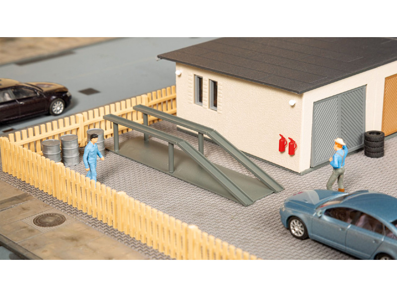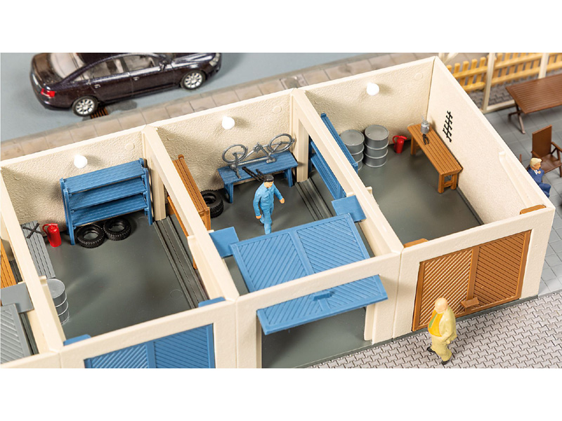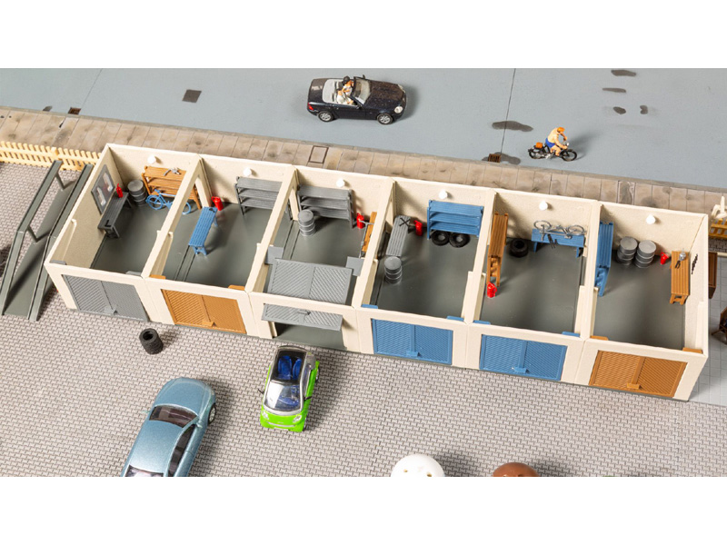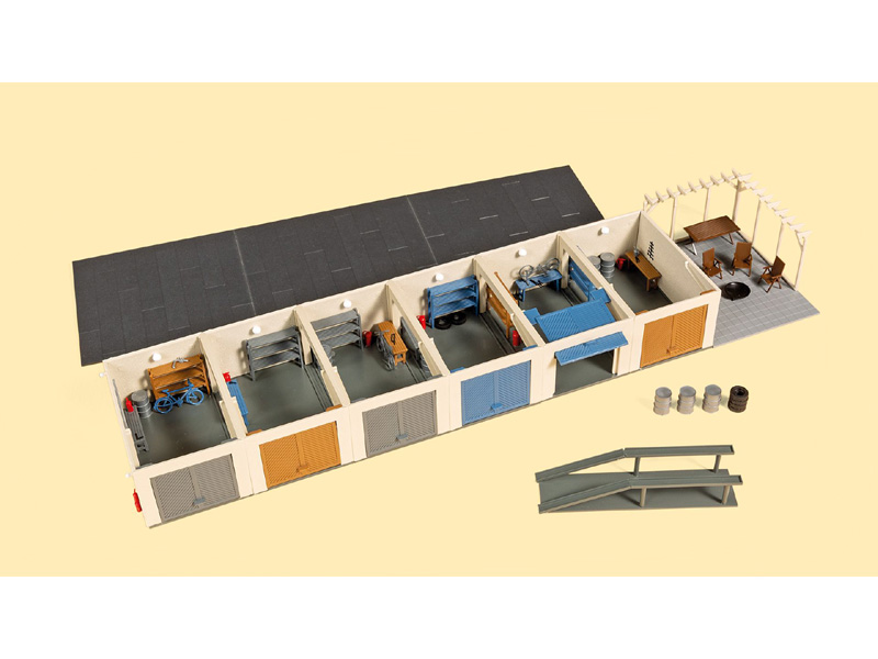 Stavebnice obsahuje šest garáží, (které lze uspořádat v řadě nebo mírně šikmo), pergolu s posezením, nájezd na auto a mnoho doplňků na vybavení garáží. Rozměry: 297 x 74 x 33 mm. Nevhodné pro děti do 14 let.
