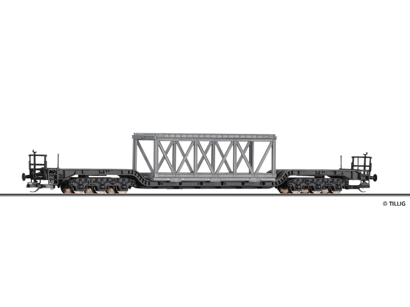 Hlubinový vůz Uaaik 761 DB naložený železnou konstrukcí. Kinematika krátkého spřáhla s šachtou dle NEM. Nevhodné pro děti do 14 let.