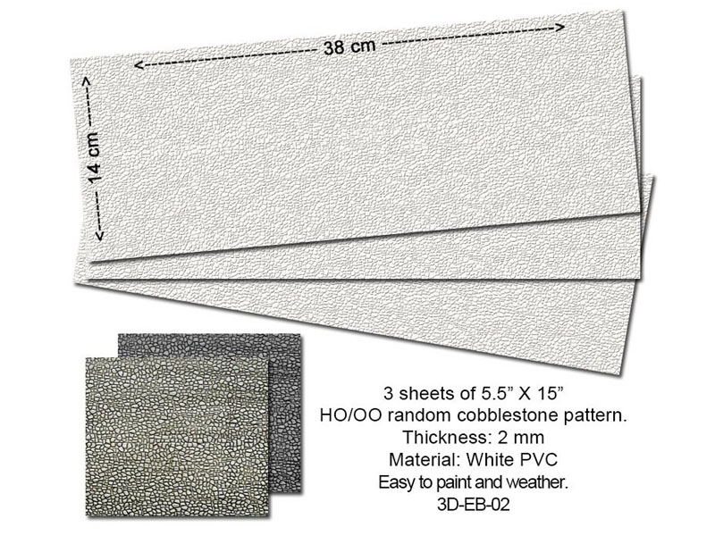 Reliéfní plastové desky lze použít pro silnice, chodníky, i zdi v měřítku H0/00. Snadné barvení emailovými i akrylovými barvami. Sada obsahuje 3 desky, každá o rozměrech 16 x 34 cm, tloušťka 2 mm v bílé barvě.