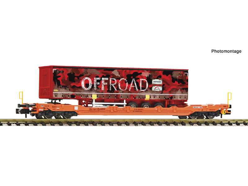 Kapsový kontejnerový vůz Sdgnss/T5 naložený návěsem Offroad. Kinematika krátkého spřáhla dle NEM 355. Nejmenší poloměr oblouku 192 mm. Není vhodné pro děti do 14 let.