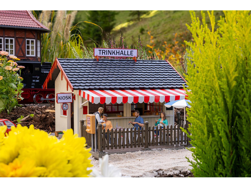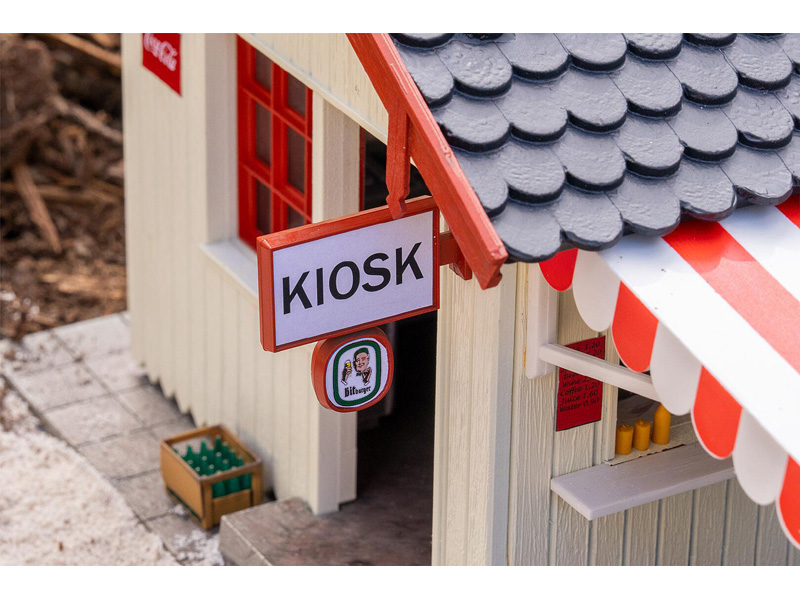 Stavebnice kiosku s předzahrádkou, součástí balení jsou dekorativní doplňky jako židle, stoly, slunečník, přepravky, automat na cigarety, reklamní cedule. Okna a dveře lze otevírat. Stavebnice odolná vůči povětrnostním vlivům. Rozměry: 375 x 335 x 220 mm. Úroveň obtížnosti: střední. Nevhodné pro děti do 15 let.