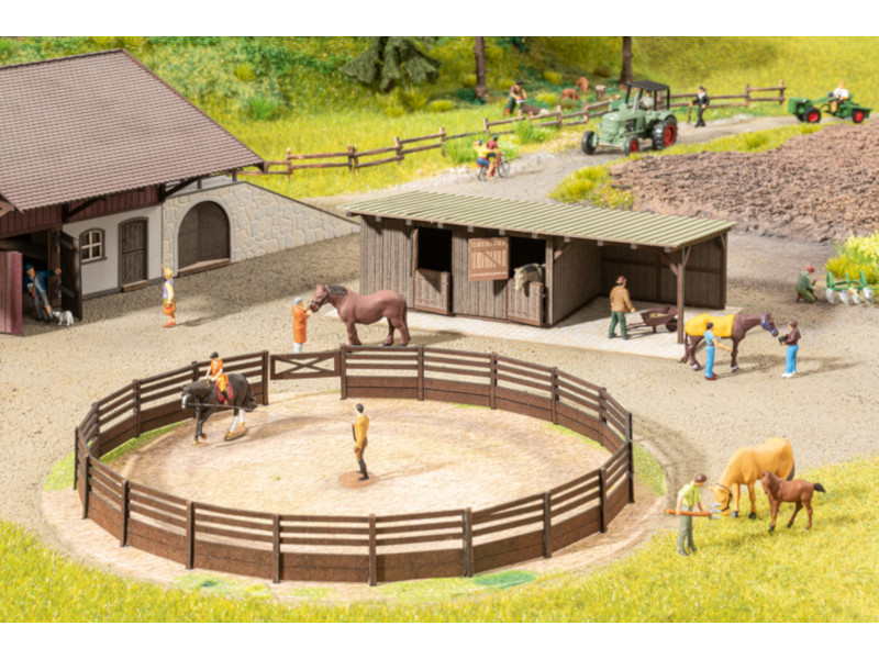 S tímto krásným lonžovacím cvičištěm přinášíte na kolejiště pohyb. Pod vedením jezdeckého trenéra je kůň s jezdkyní veden pěkně dokola. Technicky je to provedeno tak, že kůň je pohybován pomocí magnetu, který je uváděn do pohybu skrytým pohonem. Rychlost jízdy je možno nastavit pomocí vestavěného regulátoru. Zlatý hřeb tomu dává zvukový modul s reproduktorem: zatímco je kůň lonžován, ozývají se zvuky koňských kopyt a řehtání. Ke stavebnici je přiložen podrobný návod a příslušné speciální lepidlo. Rozměry: Koňské boxy: 14,1 x 8,5 cm, výška 3,8 cm. Lonžovací cvičiště: 17 x 17 cm, výška 2,3 cm. Vhodné pro velikost H0. Nevhodné pro děti do 15 let.