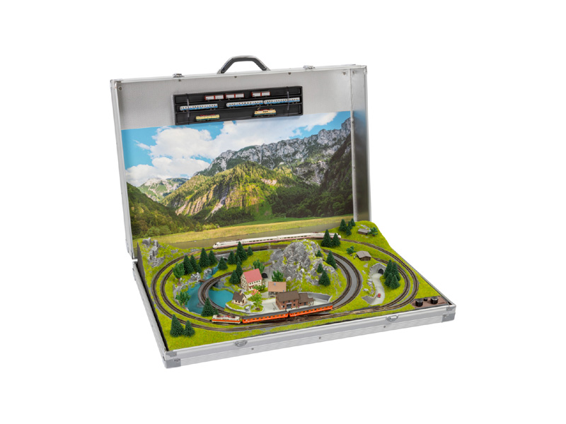 Kolejiště v hliníkovém kufříku velikosti 88,0 x 55 cm, výška 18,5 cm. Dva nezávislé okruhy umožňují provoz dvou vlaků. Krajina z tvrzeného polyuretanu. Kolejiště je dodáváno smontované, s kolejemi Märklin mini-club okamžitě schopné provozu. Možno napájet buď z baterie nebo pomocí síťového zdroje. Vozidla a napáječ nejsou součástí dodávky. Nevhodné pro děti do 15 let.