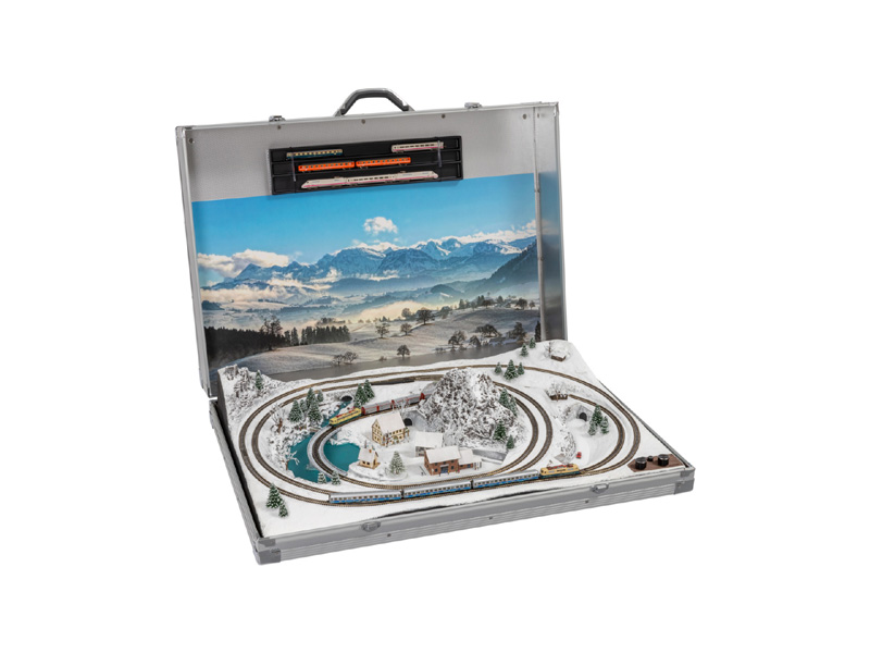Kolejiště v hliníkovém kufříku velikosti 88,0 x 55 cm, výška 18,5 cm. Dva nezávislé okruhy umožňují provoz dvou vlaků. Krajina z tvrzeného polyuretanu. Kolejiště je dodáváno smontované, s kolejemi Märklin mini-club okamžitě schopné provozu. Možno napájet buď z baterie nebo pomocí síťového zdroje. Vozidla a napáječ nejsou součástí dodávky. Nevhodné pro děti do 15 let.