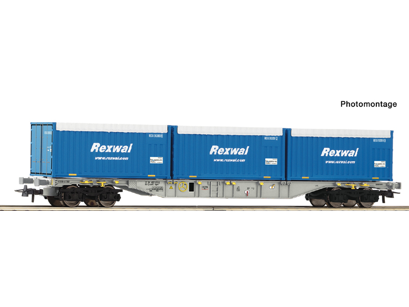 Vůz naložen třemi kontejnery Rexwal. Kinematika krátkého spřáhla dle NEM 362. Nejmenší poloměr oblouku 358 mm. Není vhodné pro děti do 14 let.