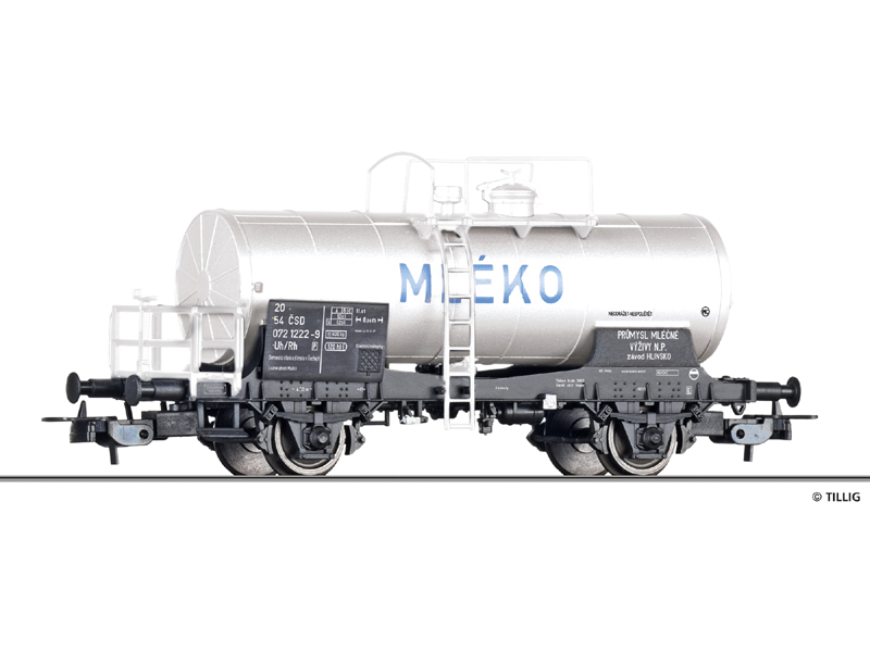 Kotlový vůz Uh s nápisem MLÉKO ČSD. Kinematika krátkého spřáhla s šachtou dle NEM. Nevhodné pro děti do 14 let.