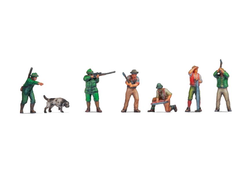 Sada obsahuje 4 figurky dřevorubců, 2 lovce a 1 psa. Figurky jsou vytištěny na 3D tiskárně v barvě. Díky této fantastické technologii jsou viditelné i ty nejmenší detaily. Velikost figurek přibližně 8 mm. Vhodné pro velikosti Z. Není určeno pro děti do 15 let.
