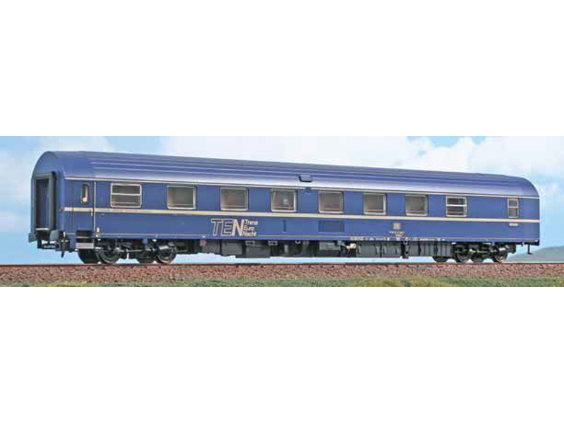Lůžkový vůz typu WLABm166 v modrém designu TEN. Nevhodné pro děti do 15 let.