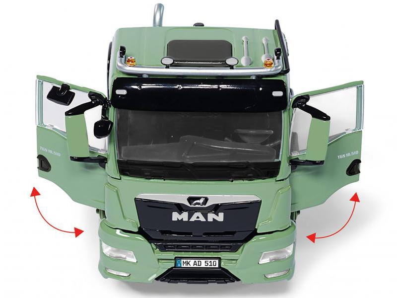 WIKING představuje dvounápravový sólo tahač v nejjemnějších detailech a dekoracích. Model se skládá z kombinace plastových a zinkových tlakově litých komponentů. Kombinace obou materiálů dělá dokonalý realistický dojem ve zmenšení 1:32. Tažné vozidlo překvapí velkým množstvím filigránových, pohyblivých prvků, které svými možnostmi plně odpovídají mezinárodně oblíbenému a uznávanému měřítku. Otevřete dveře kabiny a pohled do kabiny odhalí fascinující detaily, které jsou pro WIKING typická. Kromě toho lze vyklopit masku chladiče nahoru a otevřít tak pohled na vestavné agregáty. Přední náprava je řiditelná a sklopná kabina řidiče vám poskytne jasný výhled na přesně napodobený motor pod ní. Tažné zařízení na zadní části tahače navíc umožňuje bezproblémovou kombinaci s přívěsy ze stávající produkce v zemědělské řadě WIKING. Hned po vyjití modelu tak mohou vzniknout atraktivní kombinace. Pneumatiky modelu jsou samozřejmě navrženy s hrubým dezénem v souladu s funkcí pohonu všech kol. Vzhled zaujme především vyšším podvozkem a vysoko zavěšeným výfukovým potrubím. Sedlová deska pro připojení návěsu zajišťovací páku přívěsu. WIKING zůstává věrný svým modelářským ambicím v každé fázi: Tvůrci modelů samozřejmě nešetří na rozsáhlém doplňkovém vybavení, které se naučili v měřítku 1:32. Nejjemnější výstražná světla a samozřejmě chromované houkačky viditelně vylepšují precizní model. Nechybí ani rozsáhlé příslušenství jako boční zrcátka, ale také sluneční clony a stěrače čelního skla. Jako další doplněk je implementován systém kontroly tlaku v pneumatikách. Délka modelu cca 20 cm.