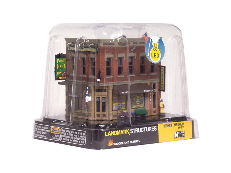 Hotový model městského rohového domu, v jehož přízemí se nachází prodejna s potravinami. Součástí balení je mnoho dekorativních doplňků. Vnitřní LED osvětlení. Rozměr: 5,87 x 3,81 cm, výška: 5,79 cm. Nevhodné pro děti do 14 let!
