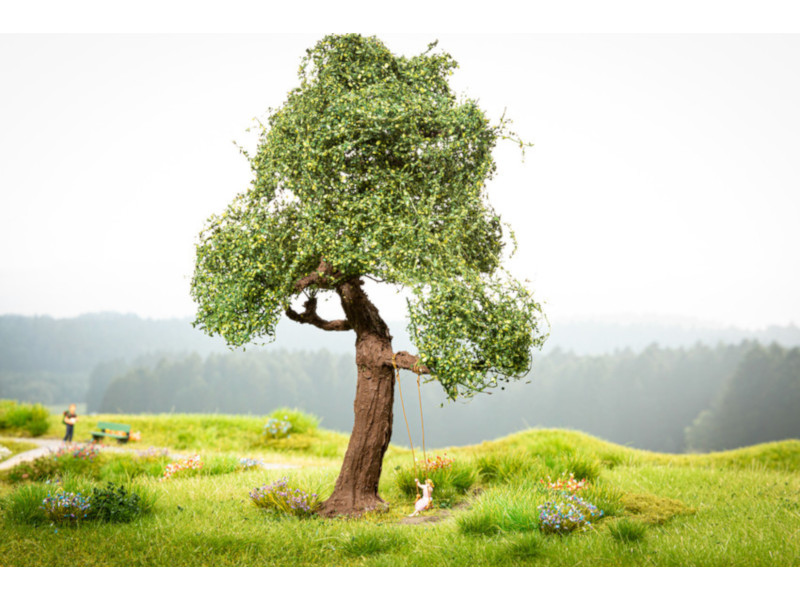 Strom s houpačkou je fascinujícím produktem z třídy pohyblivých modelů mirco-motion a přináší nádherné vzpomínky z dětství. Na nejnižší větvi mocného dubu je houpačka, na které sedí malá holčička. Strom s houpačkou je dodáván připravený k montáži. Pohon se skládá z motoru a převodovky a je umístěn pod stromem (konstrukční výška cca 35 mm). Dodávaná elektronika je připojena ke standardnímu modelářskému napáječi 16V a je vhodná pro stejnosměrný a střídavý proud. Rychlost kývavého pohybu lze nastavit na desce plošných spojů. Vhodné pro velikost H0. Výška stromu 18,5 cm. Nevhodné pro děti do 15 let.