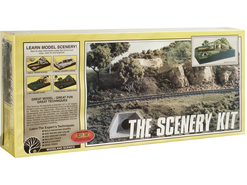 Stavebnice minidiorama z řady Scenery Kit. Balení obsahuje veškerý potřebný materiál: podstavec, konstrukční materiály, stromy, posypy, foliáže, trávy apod. Rozměr: 25,4 x 45,7 cm. Bez vlakové soupravy a kolejí.