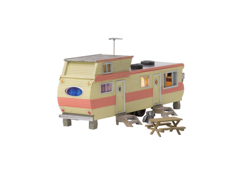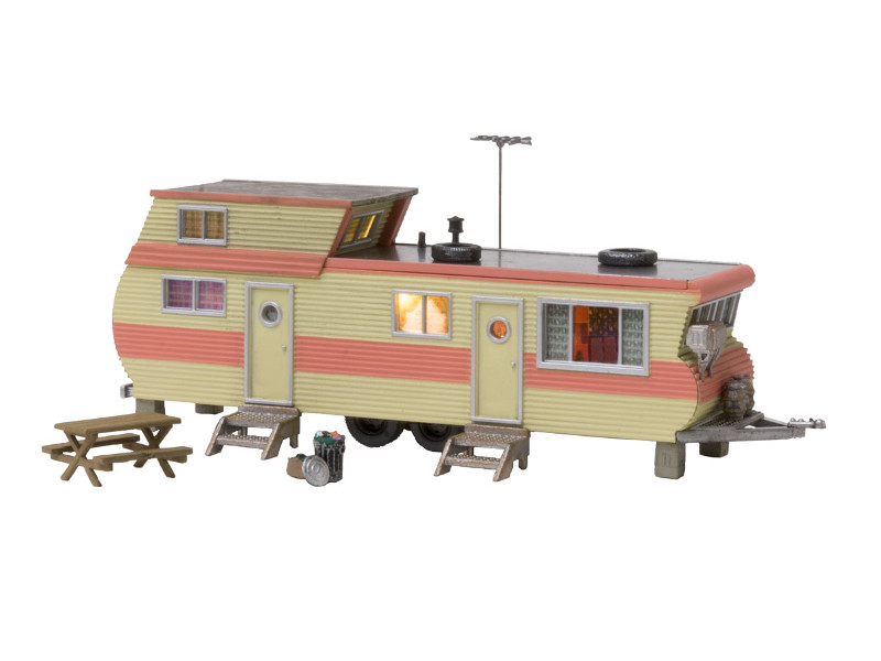 Hotový model červeného mobilheimu. Součástí balení je mnoho dekorativních doplňků. Vnitřní LED osvětlení. Rozměr: 7,93 x 4,92 cm, výška: 3,29 cm. Nevhodné pro děti do 14 let!