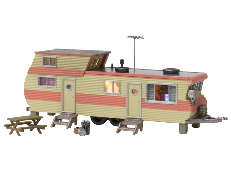 Hotový model červeného mobilheimu. Součástí balení je mnoho dekorativních doplňků. Vnitřní LED osvětlení. Rozměr: 14,6 x 6,03 cm, výška: 5,99 cm. Nevhodné pro děti do 14 let!