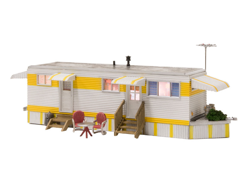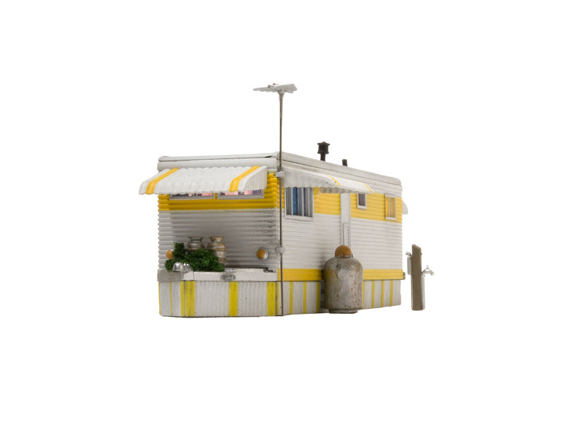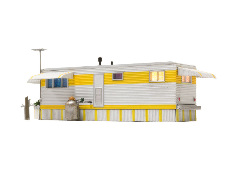 Hotový model žlutého mobilheimu. Součástí balení je mnoho dekorativních doplňků. Vnitřní LED osvětlení. Rozměr: 8,49 x 3,25 cm, výška: 2,81 cm. Nevhodné pro děti do 14 let!