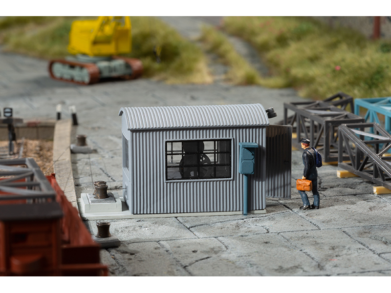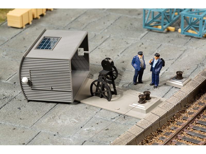 Naviják, nebo správně lanové posunovací zařízení, slouží k posunování vagonů na nakládacích kolejích, v továrních dvorech, pod nakládacími zařízeními a podobně. Tam, kde nebylo možné využívat posunovací lokomotivu, představovalo posunování pomocí navijákem tažených lan dříve velmi rozšířenou alternativu. Díky čtyřem filigránským vodicím kladkám a lanu je náš model zcela funkční. Věrná napodobenina navijákového přístřešku s vnitřním zařízením slouží modelu k zakrytí hnacího motoru. Rozměry 57 x 27 x 31 mm. Funkční model včetně motoru.