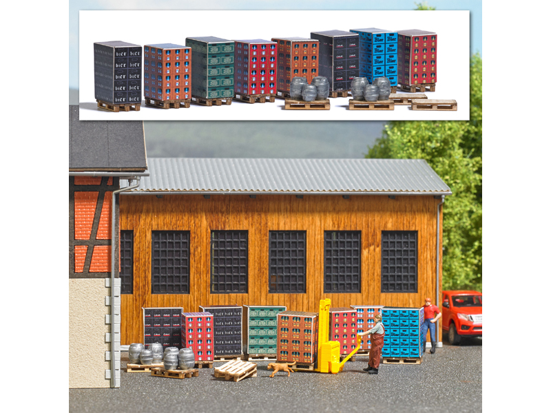 12 pravých dřevěných palet. Se 6 sudy a vystřihovánkami pro znázornění osmi stohů přepravek (pivo, limonáda, voda).