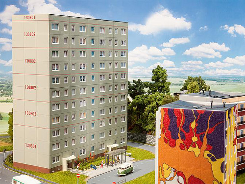 Modulární panelový dům ze 60.let. Rozměr: 305 x 155 x 125 mm. Stavebnice obsahuje: 369 dílů v 6 barvách, okenní folie a návod. Doporučené osvětlení: 180653. Obtížnost: střední. Pro slepení doporučujeme lepidlo Faller Plastikkleber. Nevhodné pro děti do 15 let.
