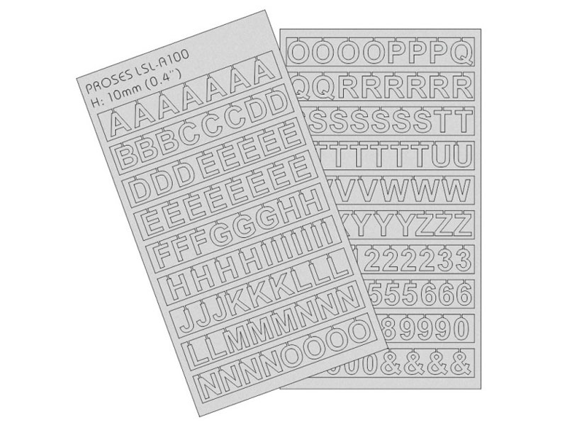 Laserem řezaná písmena pro budovy, reklamy na střechách atd. Vhodné pro všechna měřítka. 1 sada obsahuje více než 160 písmen a číslic o výšce 10 mm.