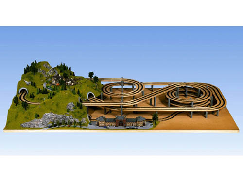Doplněk ke stoupací spirále kat.č. 53027. Obsahuje 6 překližkových segmentů = 1 kruh, výškové podpěry. Podklad má v oblouku příčné převýšení. Poloměr oblouku 329/362 mm, výška vystoupání 54 mm, šířka segmentů 100mm, vnitřní stoupání 2,61%, vnější stoupání 2,37%, vnější průměr 840 mm. Vhodné pro pro jedno- nebo dvojkolejnou trať velikosti N. Nevhodné pro děti do 15 let.