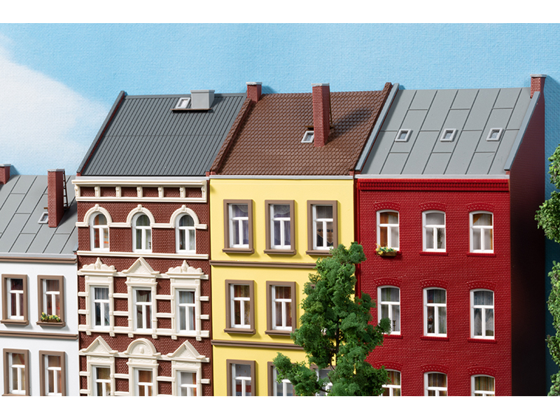 Poloreliéfní domy se výborně hodí k našim běžným městským domům ulice Schmidtstraße. Jsou spojovacím článkem k pozadí zařízení a šetří místo. Pět domů, které lze postavit v libovolném pořadí, se vyznačuje různou výškou podlaží a různou úpravou fasády. V některých budovách je detailní a obsáhlé zařízení obchodu. Rozměr 387 x 45 x 214 mm.