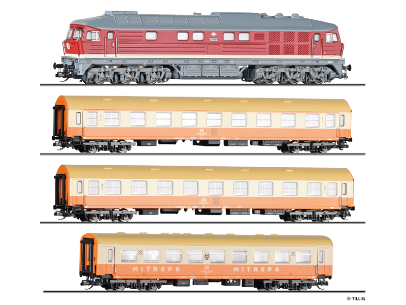 Prémiová startovací sada osobního vlaku DR Städteexpress, obsahuje dieselovou lokomotivu řady 132, osobní vůz 1. třídy typu Y/B 70, osobní vůz 2. třídy typu Y/B 70, jídelní vůz WR, kolejový ovál, jízdní ovladač TILLIG, nakolejovač. Digitální dekodér vestavěn. Čelní a koncové osvětlení LED přepínané v závislosti na směru jízdy. Vagóny připraveny pro vestavbu vnitřního osvětlení. Kinematika krátkého spřáhla s šachtou dle NEM. Nevhodné pro děti do 14 let.