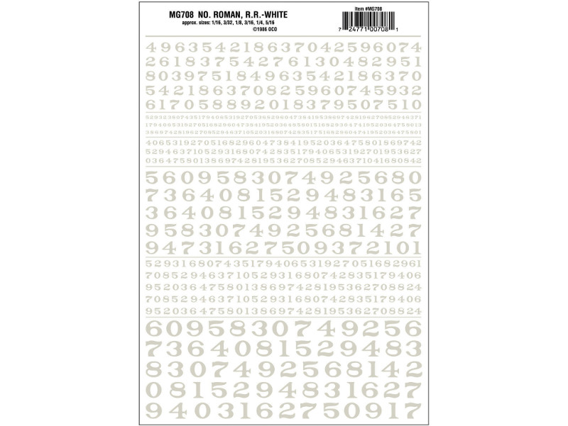 Velikost číslic: 1/16 (1,58 mm), 3/32 (2,38 mm), 1/8 (3,17 mm), 3/16 (4,76 mm), 1/4 (6,35 mm), 5/16 (7,93 mm). Balení obsahuje 1 aršík.