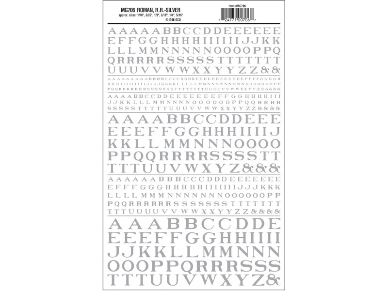 Velikost písmen: 1/16 (1,58 mm), 3/32 (2,38 mm), 1/8 (3,17 mm), 3/16 (4,76 mm), 1/4 (6,35 mm), 5/16 (7,93 mm). Balení obsahuje 1 aršík.