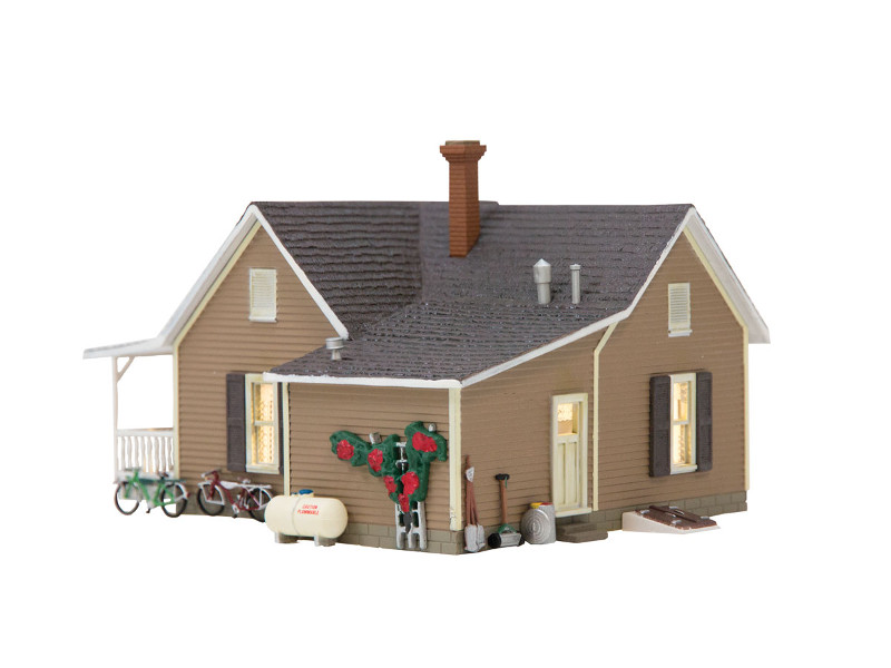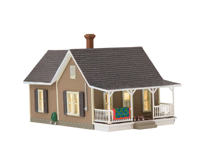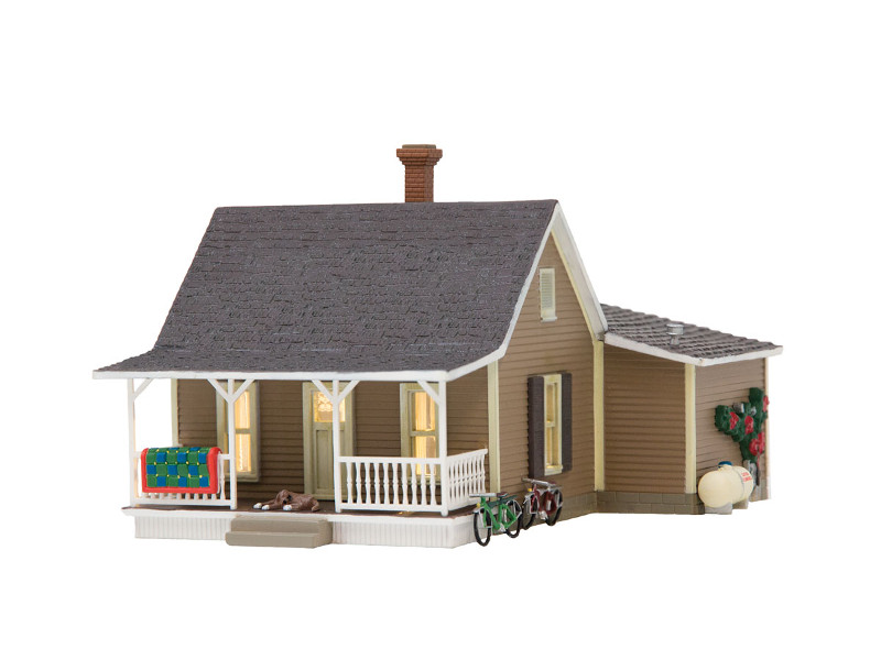Hotový model rodinného domu s terasou. Součástí balení je mnoho dekorativních doplňků. Vnitřní LED osvětlení. Rozměr: 9,52 x 13,8 cm, výška: 7,62 cm. Nevhodné pro děti do 14 let!