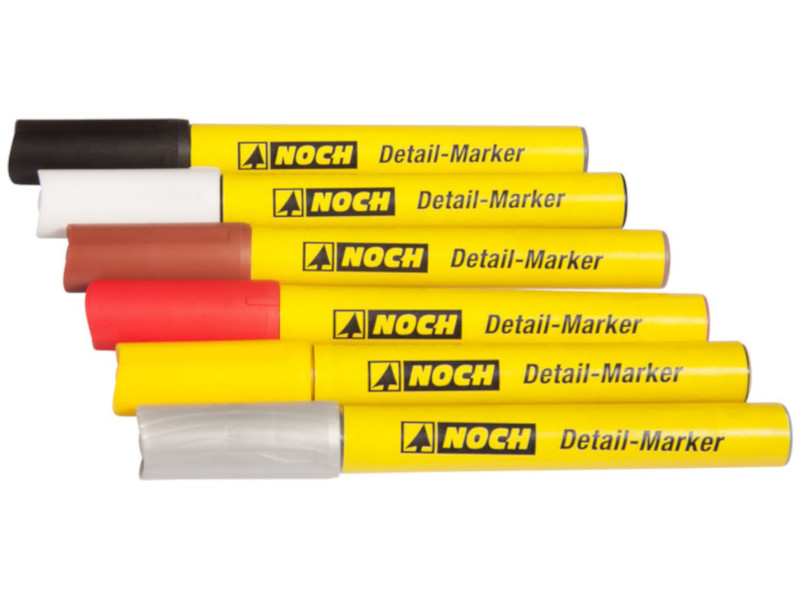 V modelovém světě existuje celá řada detailů, na které potřebuje člověk velmi málo barvy. Mnohdy se ani nevyplatí kupovat celou lahvičku modelářské barvy, špinit štětec,atd. Z toho důvodu přináší na trh firma NOCH sadu barevných značkovačů. Akrylové barvy na vodní bázi je možno nanášet na nejrůznější podklady: kov, plast, dřevo, papír, sklo, keramiku atd. Všechny barvy jsou po zaschnutí realisticky matné. Špička popisovače je široká asi 2 mm. Díky tomu je použití velmi jednoduché: Popisovačem před upotřebením trochu zatřepejte, odejměte krytku. Po použití zakryjte popisovací hrot opět krytkou. Obsah: 6 popisovačů. Vhodné pro všechny velikosti. Nevhodné pro děti do 15 let.