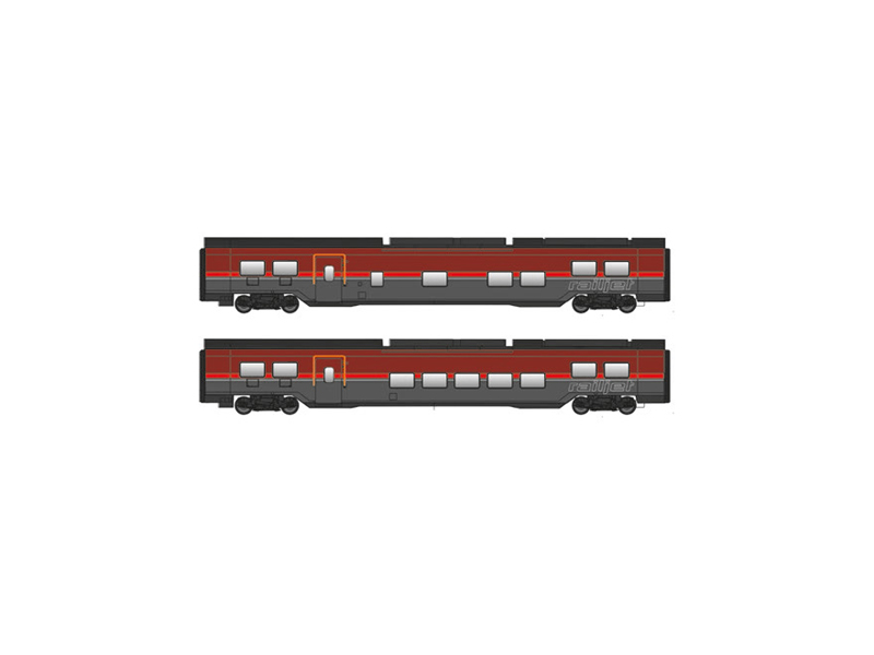 Set dvou osobních vozů Railjet, 2. třída. Interiérové osvětlení. Minimální poloměr oblouku 419 mm. Není vhodné pro děti do 14 let.