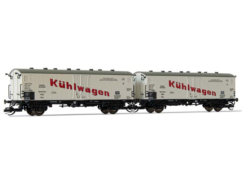 Model dvou chladírenských vozů řady Gfkhs, Saarbrücken Kühlwagen, DRG. Model má šachtu a kinematiku krátkého spřáhla a umožňuje tak jízdu nárazník na nárazník. Minimální poloměr oblouku 310 mm. Není vhodné pro děti do 14 let.