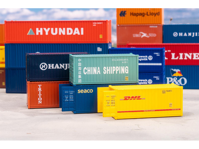 Set pěti kontejnerů společnosti HANJIN, TRITON, CHINA SHIPPING, DHL, SEACO. Stavebnice obsahuje 40 dílů v 5 barvách. Rozměry: 69 x 28 x 30 mm. Úroveň obtížnosti: mírná. Nevhodné pro děti do 15 let.