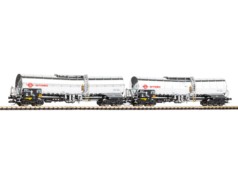 Set dvou kotlových chromovaných vozů na převoz chemikálií. Vynikající jízdní vlastnosti. Kinematika krátkého spřáhla s šachtou dle NEM. Minimální poloměr oblouku 310 mm. Není vhodné pro děti do 14 let.