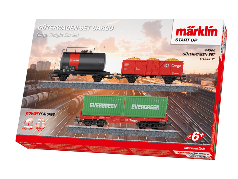 Otevřený nákladní vůz, cisternový vůz a kontejnerový vůz ve fiktivním, dopravní červeném laku DB Cargo. Model: Otevřený nákladní vůz s pískem. Cisternový vůz s plošinou pro brzdaře. Kontejnerový vůz naložený dvěma 20stopými kontejnery. Kontejnery vhodné pro děti lze otevírat. Všechny vozy jsou vybaveny spřáhly Relex. Výměnu dvojkolí za izolovaná DC E700580 provedeme zdarma. Není vhodná pro děti do 6 let.